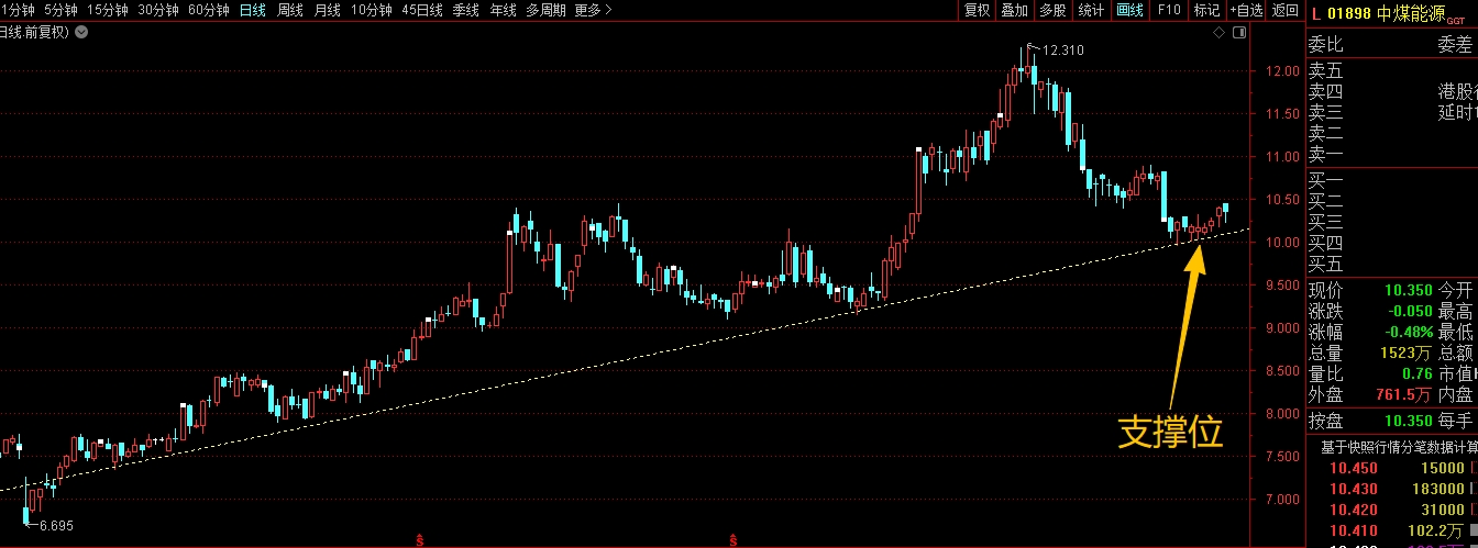 $中煤能源(HK|01898)$ 中期趋势比较稳健,一直震荡上行,近期高位回落调整,目前主要是沿着低位趋势线运行,接下来就看趋势线的得失,能稳住就没问题,但有效跌破就要注意短线的回落风险了,需要控制仓位应对。#炒股日记# #周末杂谈#