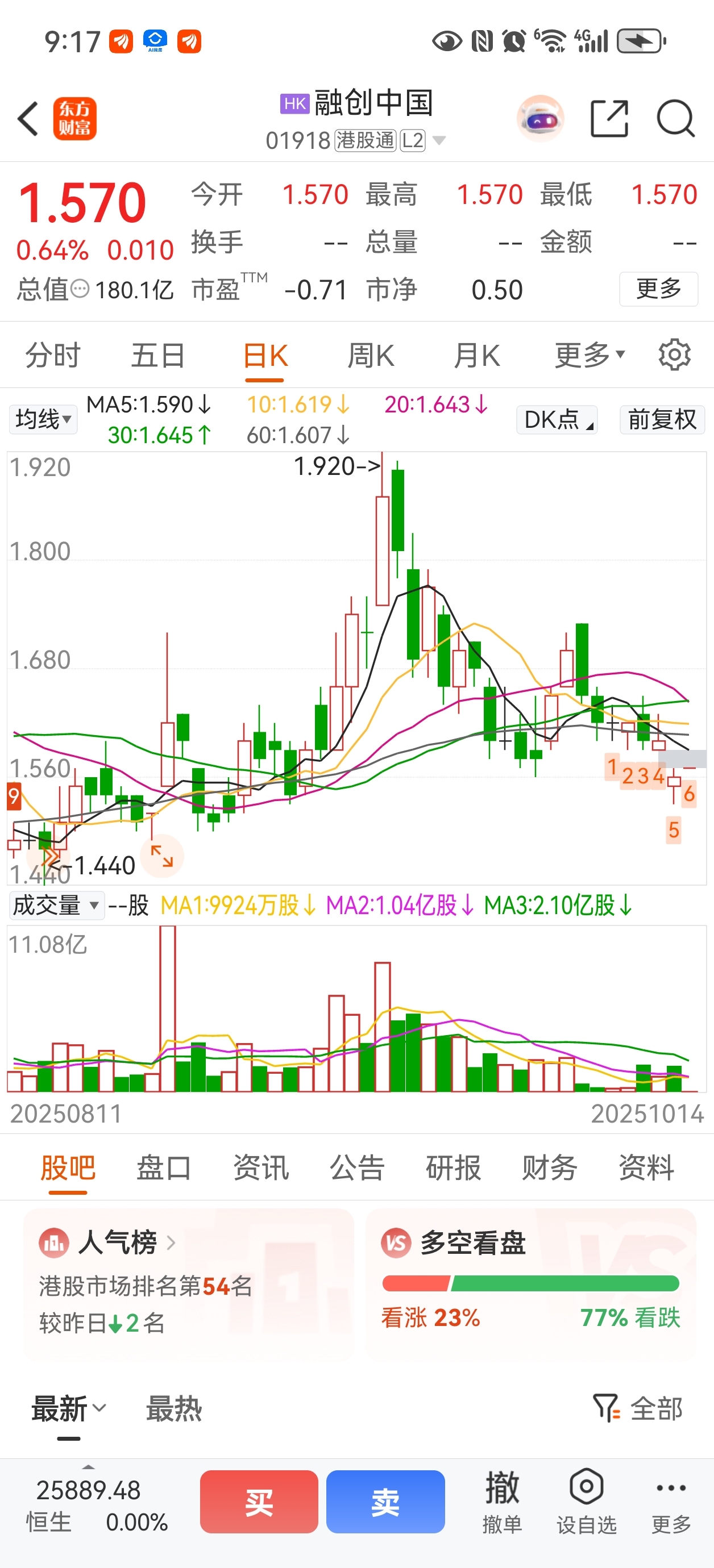 $融创中国(HK|01918)$ 不太好啊,序列6出现了,估计还有一周的调整。