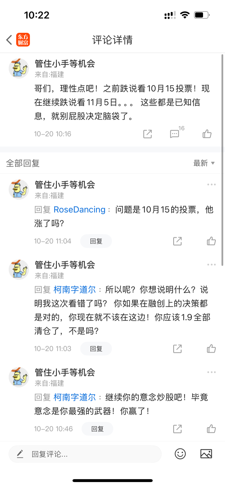 温馨提示: 1.根据《证券法》规定,禁止编造、传播虚假信息或者误导性信息,扰乱证券市场;2.用户在本社区发表的所有资料、言论等仅代表个人观点,与本网站立场无关,不对您构成任何投资建议。用户应基于自己的独立判断,自行决定证券投资并承担相应风险。《东方财富社区管理规定》