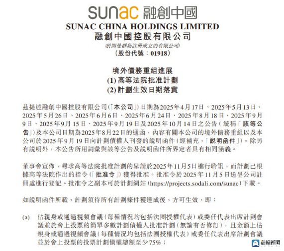 11月5日,融创中国控股有限公司发布公告,约96亿美元的境外债务重组获香港高等法院批准