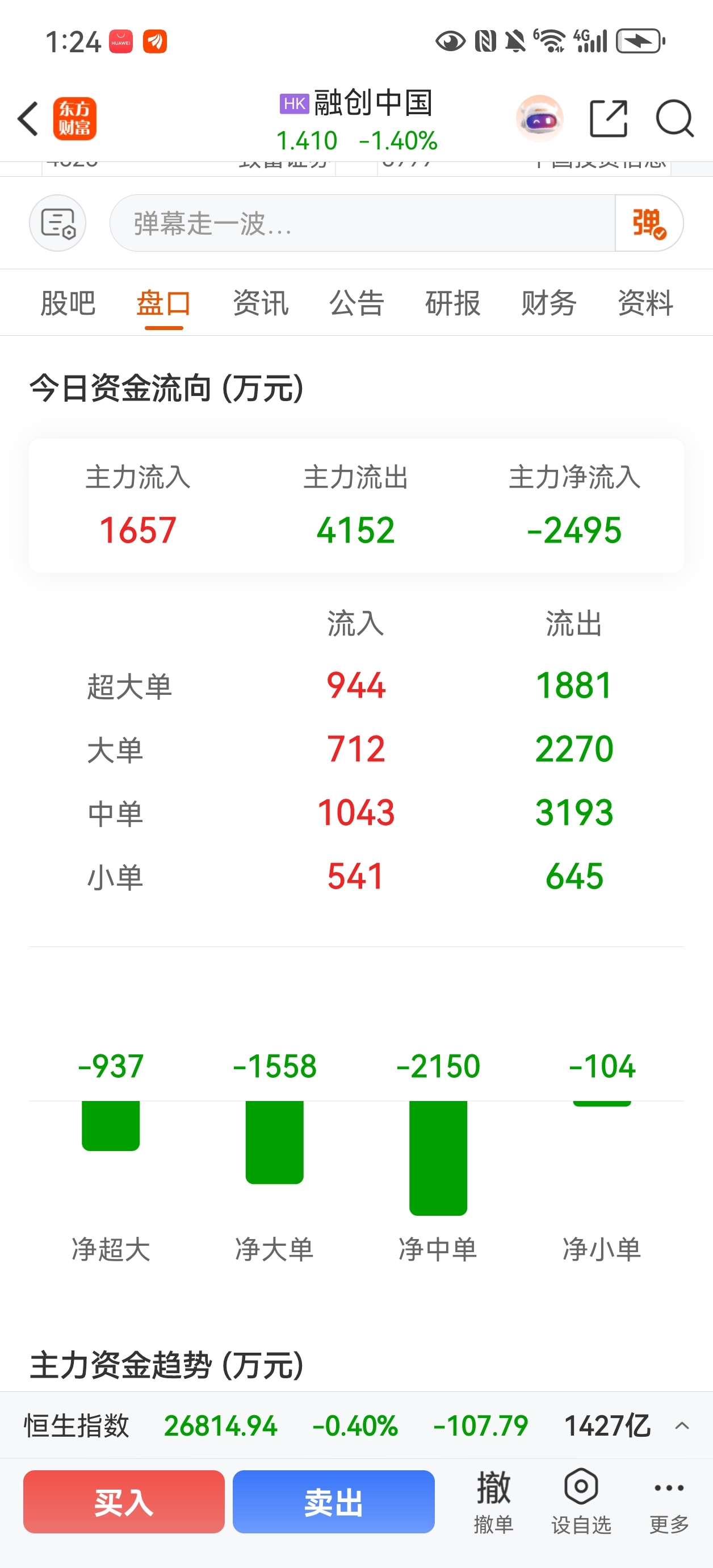 $融创中国(HK|01918)$ 今天资金流出了好多