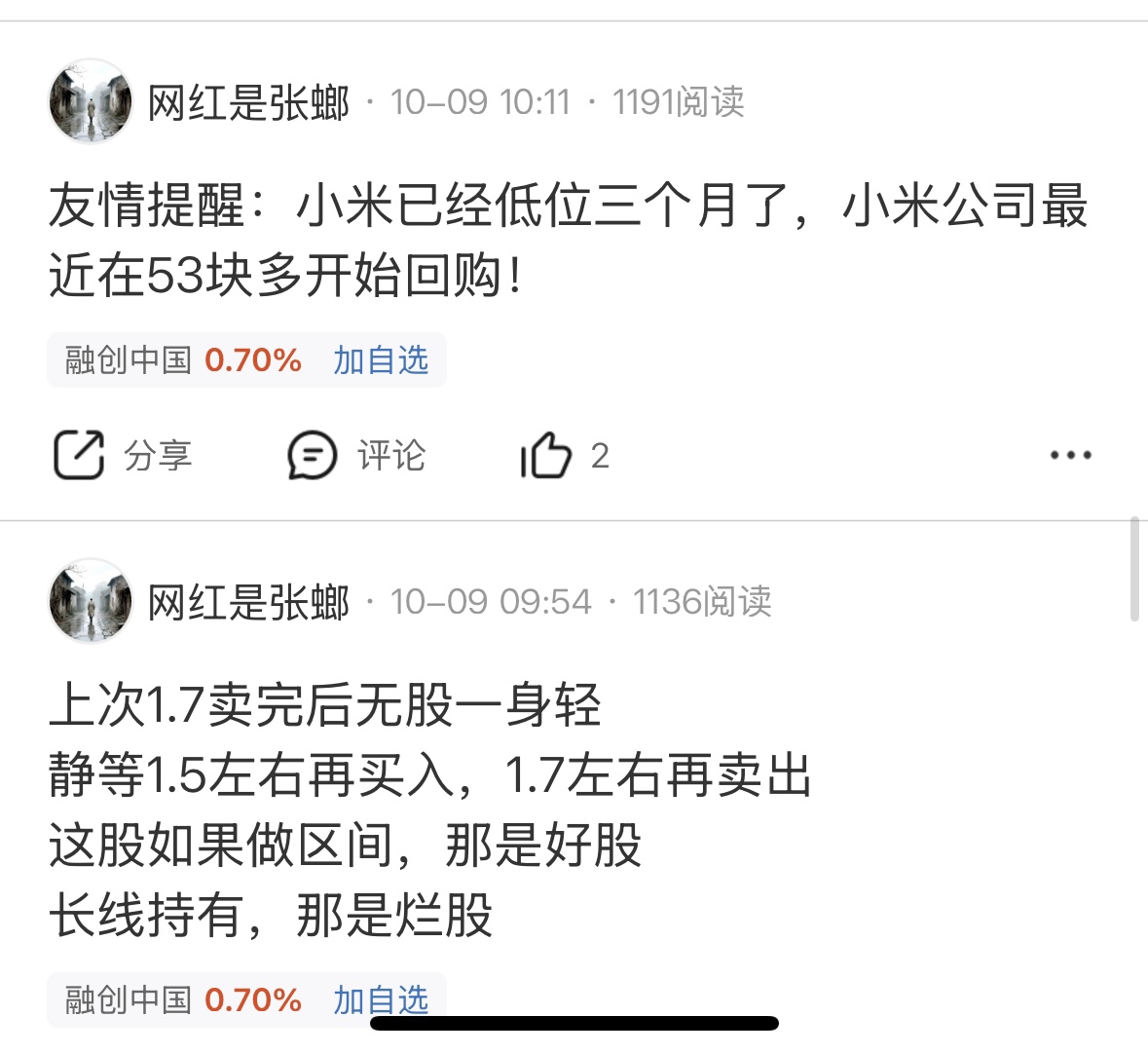 你的小米吹53回购的利好,怎么跌到43了?这个点被你忽悠去买的,现在一起站岗了吧?