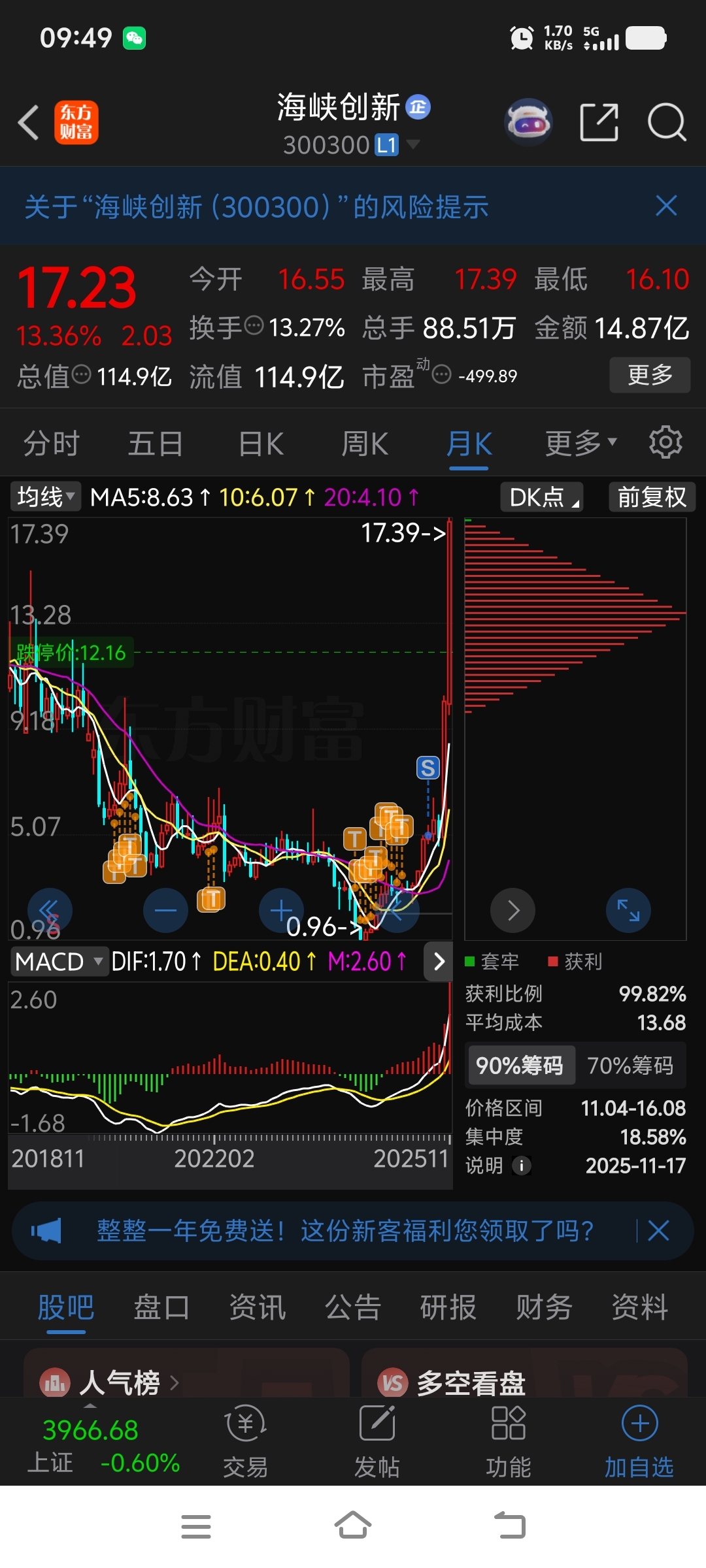 今年炒股最大的错误是卖了海峡创新买了融创,而且是满仓操作,真是心里苦啊,海峡创新