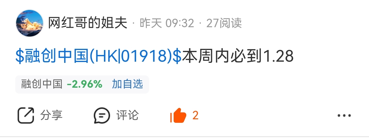 $融创中国(HK|01918)$ 我的预测还差一点点,加油