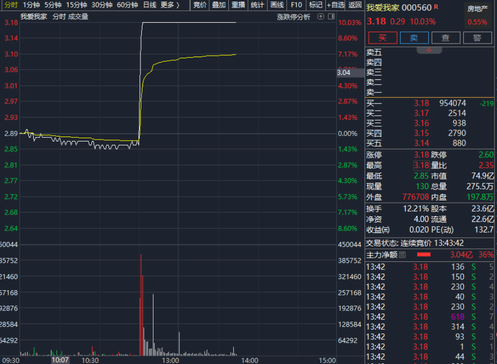 今日上午11时左右,A股地产股大幅拉升,2分钟的时间,我爱我家的股价从-1%的位置直线拉升至10%涨停。随后,特发服务、世联行、福星股份、光大嘉宝、德必集团集体跟涨,招商蛇口、金地集团、保利发展、万科A等地产龙头也纷纷跟涨。