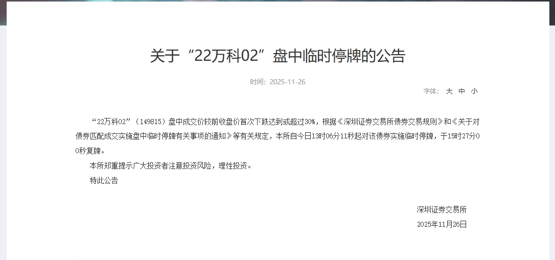 今天更离谱,著名国资背景地产万科上演一出连续触发停牌的戏码,可想而知投资者有多恐慌。这次触发停牌的是万科债券“22万科02”午后跌超30%,触发二次临时停牌,堪称股债双杀,投资者到底有多绝望!