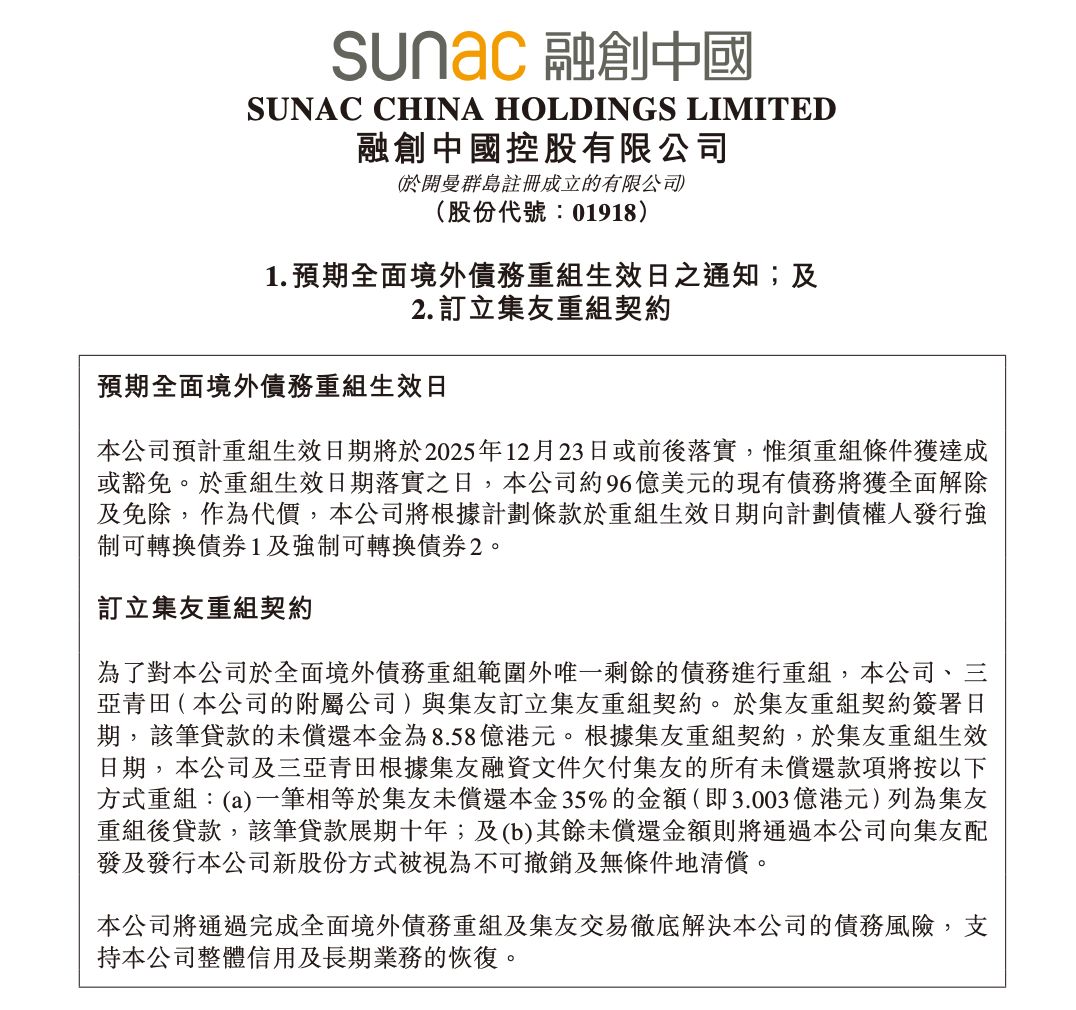 12月17日晚间,融创中国在港交所公告,重组生效日期预计于2025年12月23日或前后落实,惟须重组条件获达成或豁免。于重组生效日期落实之日,公司约96亿美元的现有债务将获全面解除及免除。作为代价,公司将根据计划条款于重组生效日期向计划债权人发行强制可转换债券。