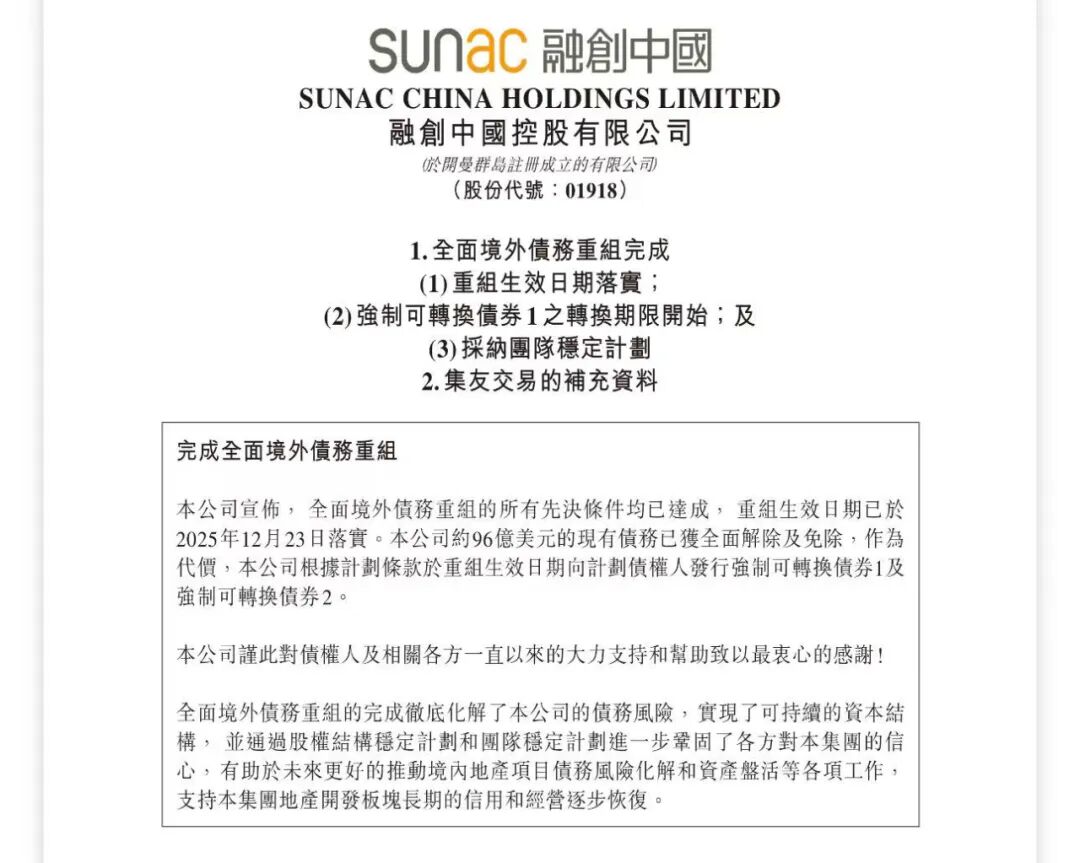 融创中国12月23日晚间公告,公司全面境外债务重组的所有先决条件均已达成,重组生效日期已于12月23日落实。公司约96亿美元的现有债务已获全面解除及免除,作为代价,公司根据计划条款于重组生效日期向计划债权人发行强制可转换债券1及强制可转换债券2。