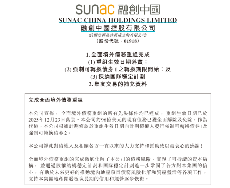 12月23日,融创中国在港交所公告,全面境外债务重组的所有先决条件均已达成,重组生效日期已于12月23日落实。公司约96亿美元的现有债务已获全面解除及免除,作为代价,公司根据计划条款于重组生效日期向计划债权人发行强制可转换债券1及强制可转换债券2。