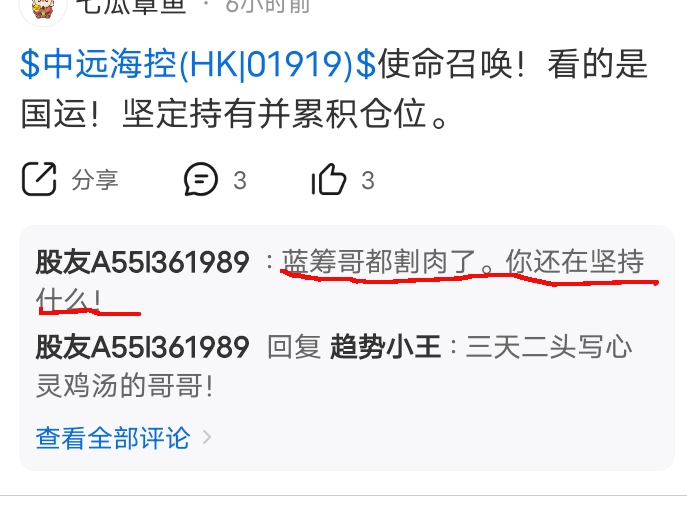 如果你是价值投资者,把中远海控的目标价定在最低20港元,那现在跌到了12港元,而且分红一个月内到帐,那索性就盼着它一直跌下去,这个才是真格局。