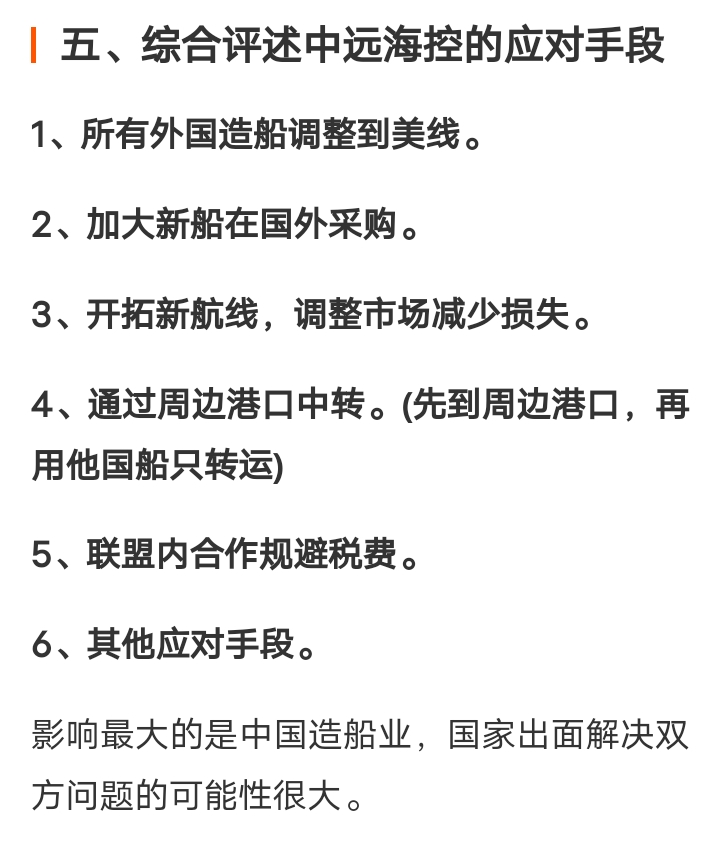 二是文中提到的国家出面,最近国家出台海运条例,恰恰是对301条例停靠费征收的反制政策,我相信国家是最好的靠山。