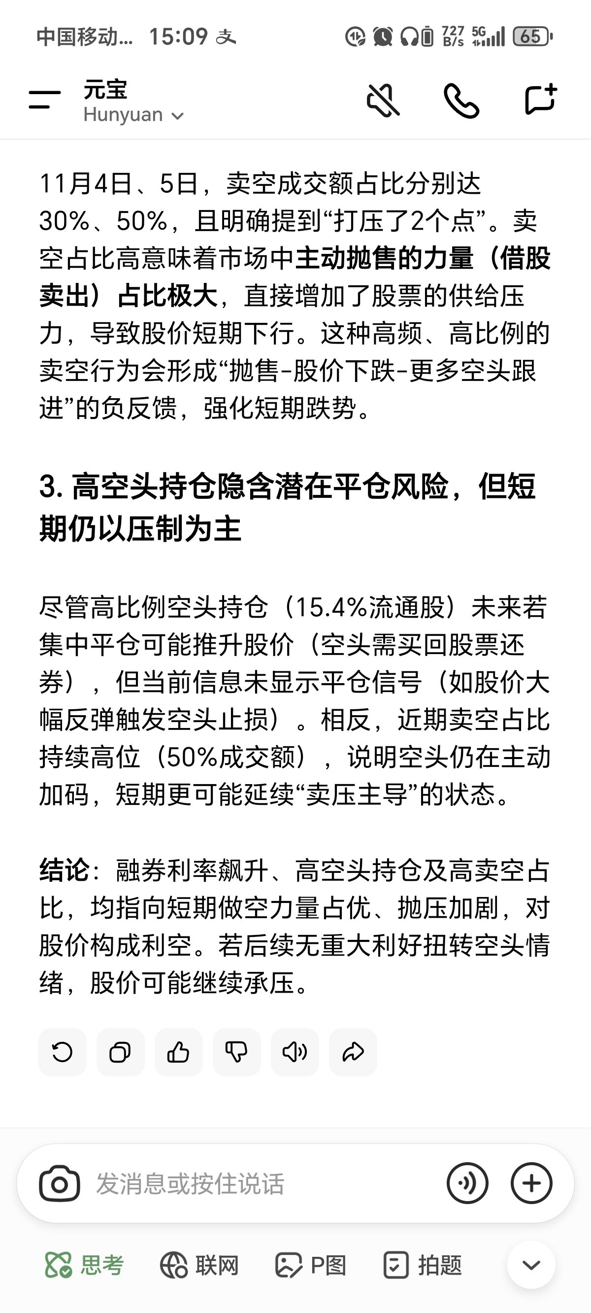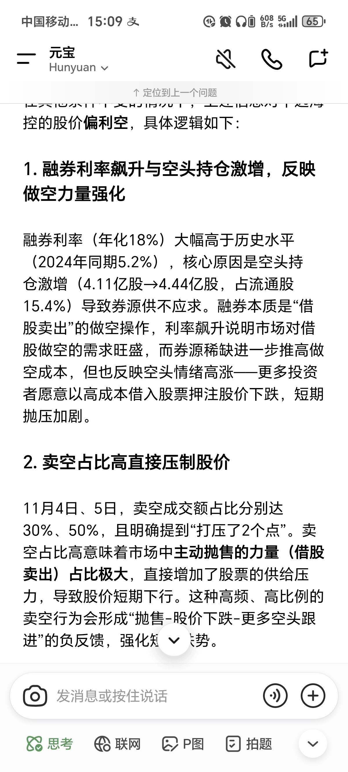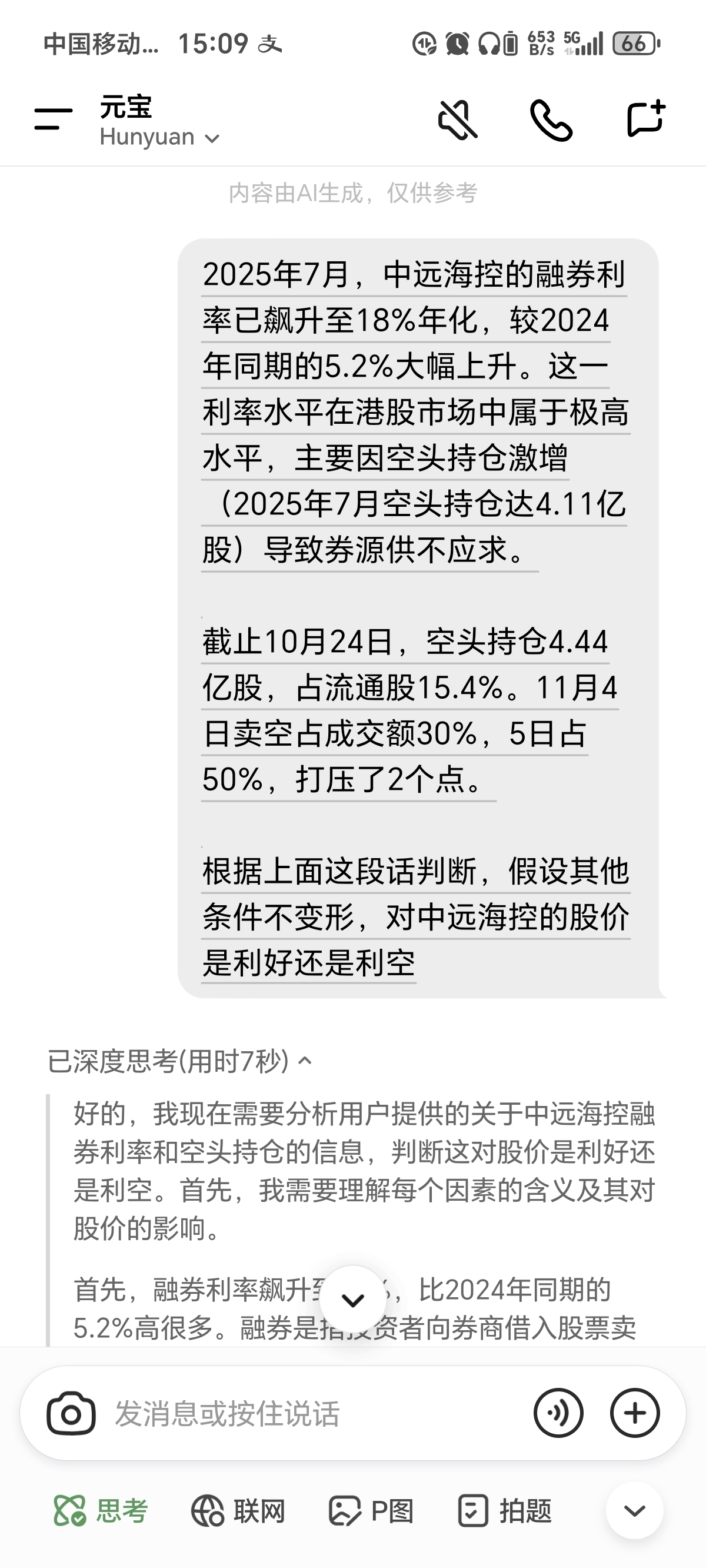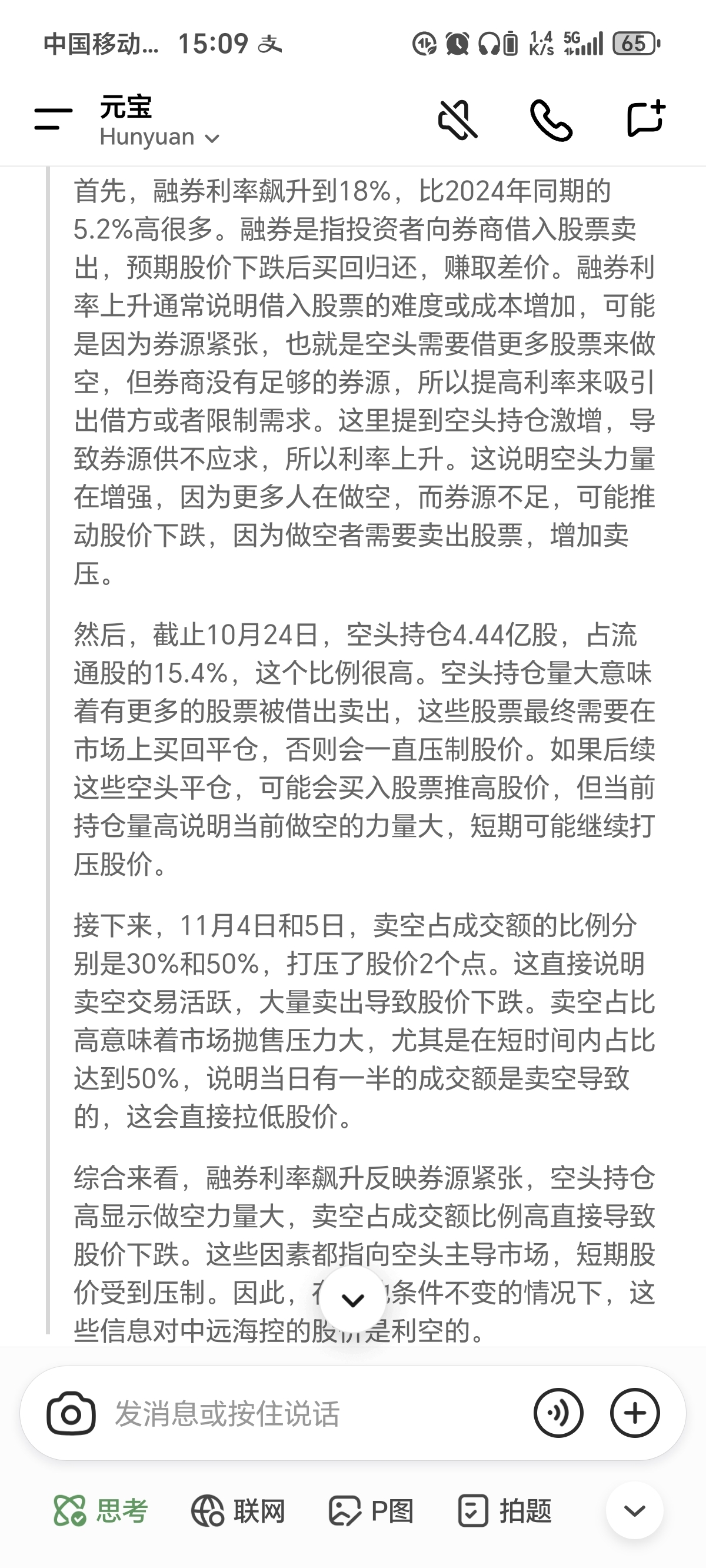 $中远海控(HK|01919)$ 2025年7月,中远海控的融券利率已飙升至18%年化,较2024年同期的5.2%大幅上升。这一利率水平在港股市场中属于极高水平,主要因空头持仓激增(2025年7月空头持仓达4.11亿股)导致券源供不应求。截止10月24日,空头持仓4.44亿股,占流通股15.4%。11月4日卖空占成交额30%,5日占50%,打压了2个点。