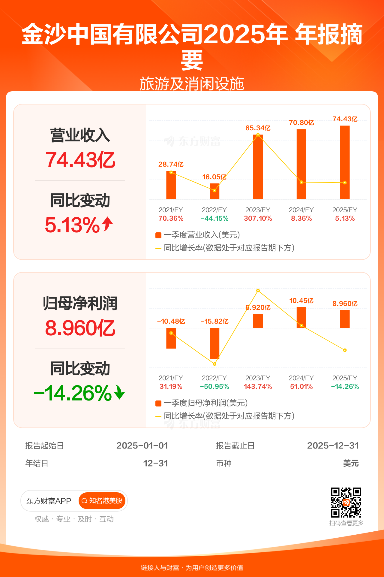 金沙中国有限公司2月13日发布年报业绩,截至2025年12月31日的12个月内,该公司营业收入74.43亿美元,同比增长5.13%;公司权益持有人应占溢利(归母净利润)8.96亿美元,同比减少14.26%,低于机构一致预测的13.22亿美元。