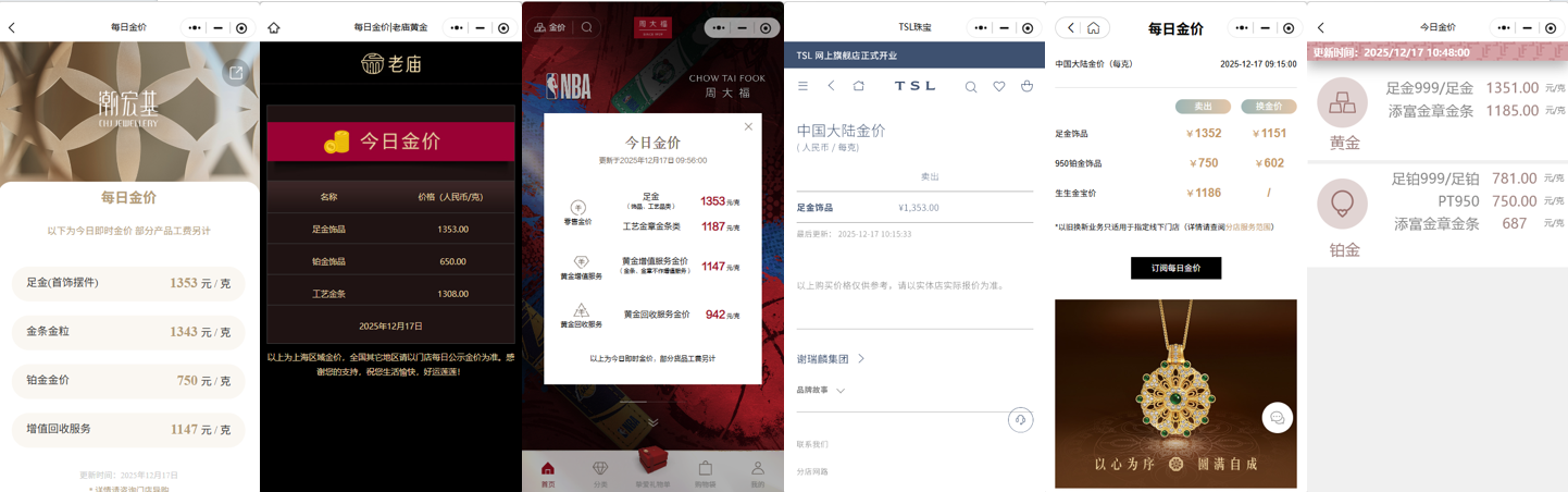 具体而言,当日,老庙黄金上海区域足金饰品、周大福足金(饰品、工艺品类)、谢瑞麟足金饰品、潮宏基足金(首饰摆件)境内价格为1353元/克,周生生境内足金首饰价格为1352元/克,六福珠宝足金999/足金境内价格为1351元/克。