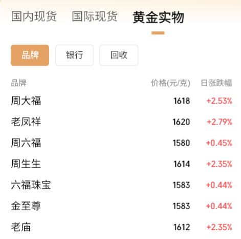与此同时,国内多家品牌金饰克价也出现大幅上涨,站上1600元大关,创历史新高。