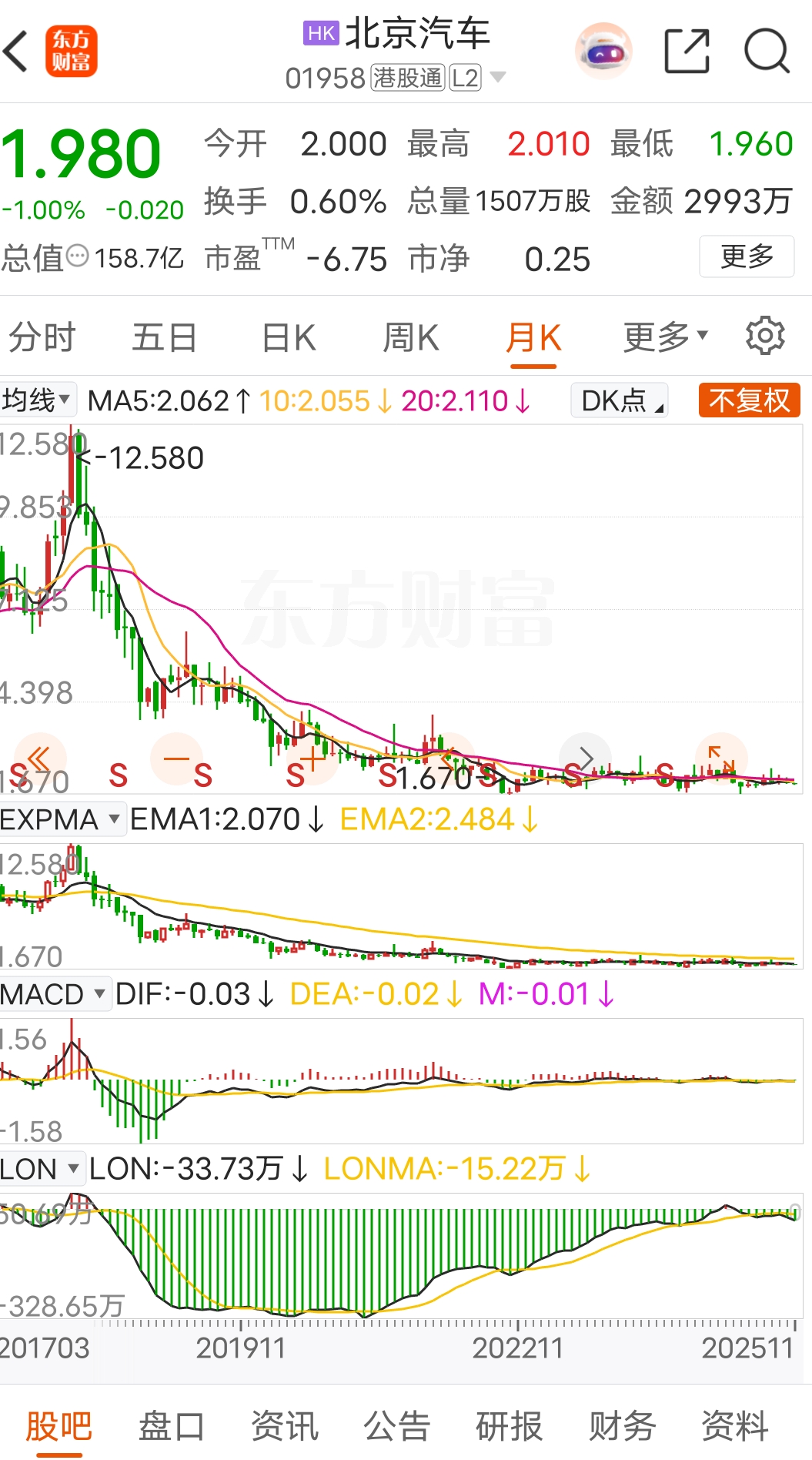 北京汽车:题材多多,月线级别的历史大底部,有何惧哉!十几年前8.9元发行,现股价足够便宜哟!请大家看一下月线。