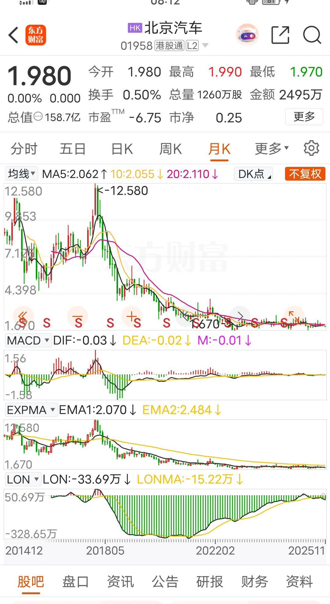 在大牛市背景下,北京汽车长久时间盘恒在2.0附近,其股价表现与公司的基本面极度相悖 ,与同类上市公司股价表现出现天壤之别,比如截止今年三季度应收只有12亿的海马汽车,市净率竟被炒到超过九倍,而北京汽车截止今年三季度营收超过120个亿,其市净率只有可怜的0.26倍,再比如东风集团股份截止今年第三季度营收500多个亿,其股价比去年的最低点整整翻了五、六倍,值得注意的是东风集团股份在2023年曾经出现巨额亏损高达40多亿,而北京汽车近年来未出现过亏损。