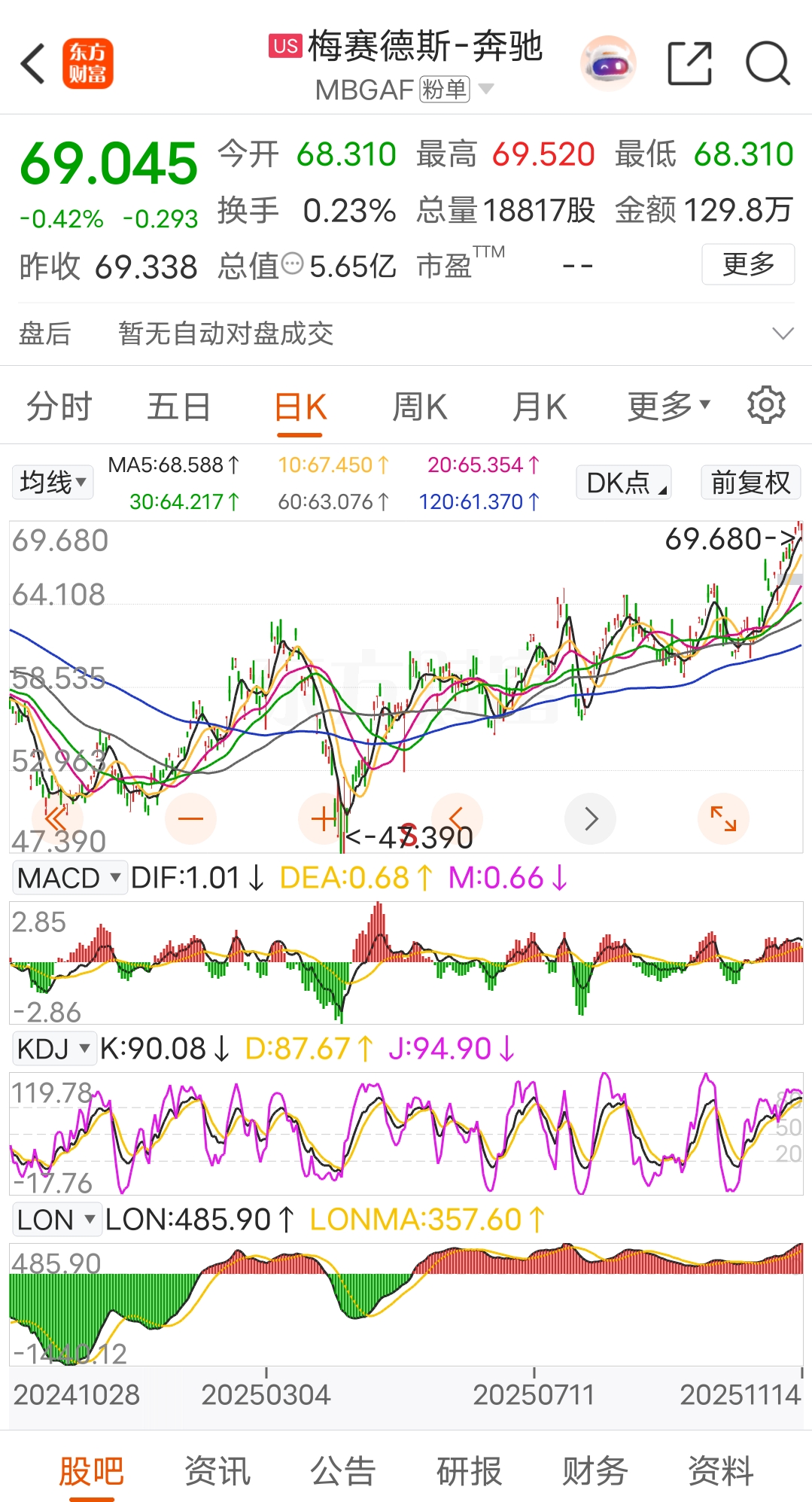 再请朋友们看一下梅赛德斯奔驰公司最近半年多来的股票走势(北京汽车持有北京梅赛德斯奔驰51%的股份)
