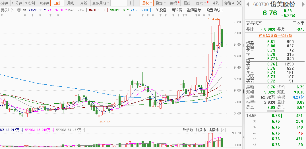 岱美股份:汽车零部件,上周五低开低走收中阴线,不过好在一个是带有下影线尾盘有所回升,第二个是本身市场弱,该股有被拖累错杀因素,加上本身位置不算高,距离下方的年线和筑底支撑以及10均线趋势支撑都不算远,估计周一支撑上移,止跌就有企稳反包预期先等等。