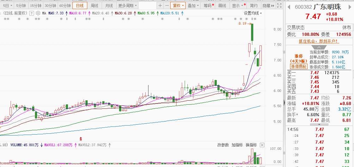 广东明珠:大消费冶钢原料+业绩增长。上面要求要持续用力扩大内需,做强国内大循环,不断形成扩内需的新增长点,这催化了大消费新的动力。明珠本来连续三天阴线调整,股价回到10均线支撑附近,上周五支撑企稳反包涨停,实现6天3板,释放抛压重新涨停后上涨趋势得到延续和转强,加上经过调整新的姿金注入,拉升动力得到加强,位置也回到安全范围的相对低位,有继续向上冲锋预期。