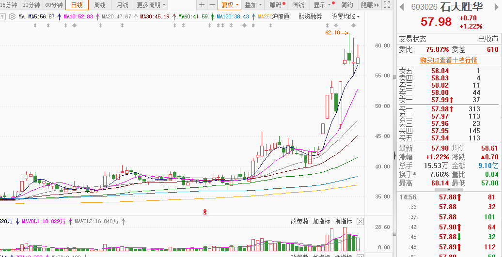 石大胜华:电池,上周五5均线支撑上方收阳线,小涨1个多点,均线依然向上运行主升浪趋势还在没有反转迹象,先看看周一能否沿着趋势向上加速。