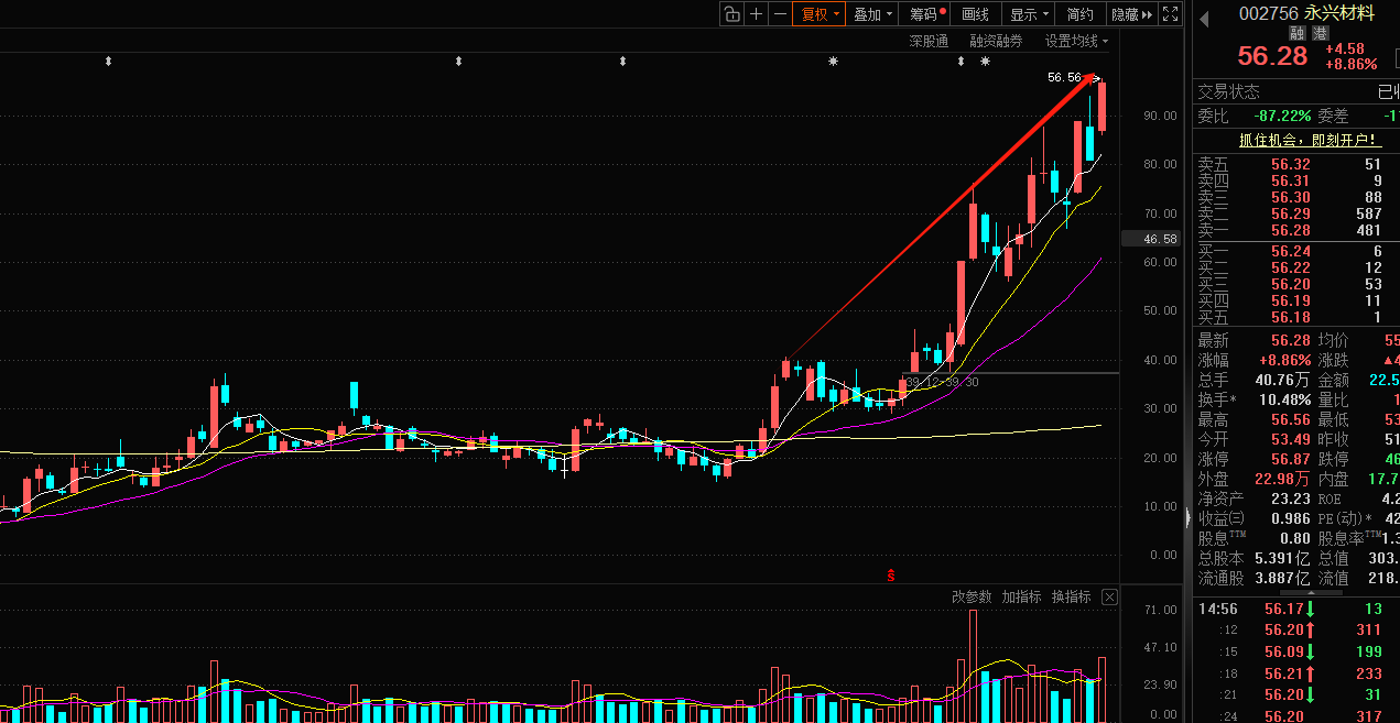 永兴材料002756:原本想的是今天只要能不破5均直接反包就算强,如我所料,但是今天反复几次不去上板,担心会再度回调一下,所以先撤了。当然了,也许会想前面拿永太科技那样,但是知足就好。