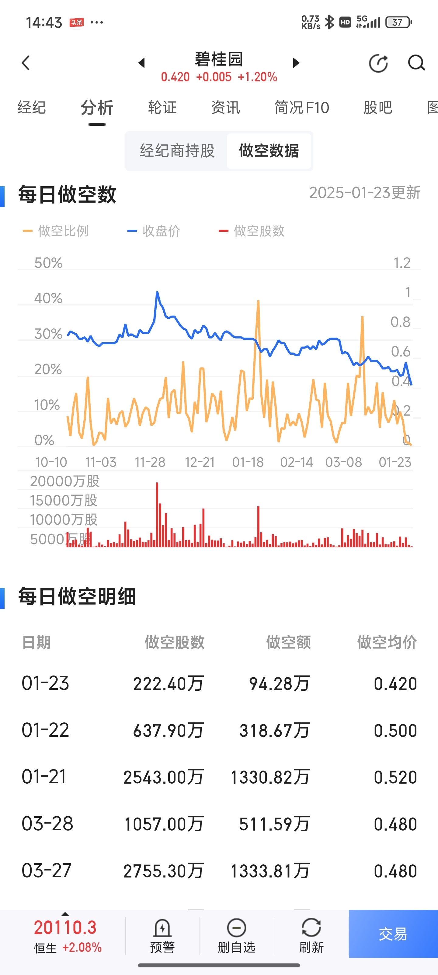 $碧桂园(HK|02007)$ 从这五天买卖来看,港股通只卖出了约3亿股,还有38亿没动!往下走估计是得不到这部分股的了!做空的也少。大家可能的预期都是大碧能重组成功,会活下来,港股通开了,就无限可能