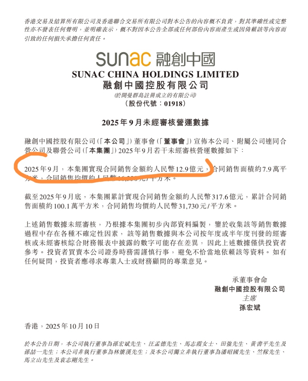 9月份合同销售金额约25.8亿元,融创13亿元,绿城128亿。