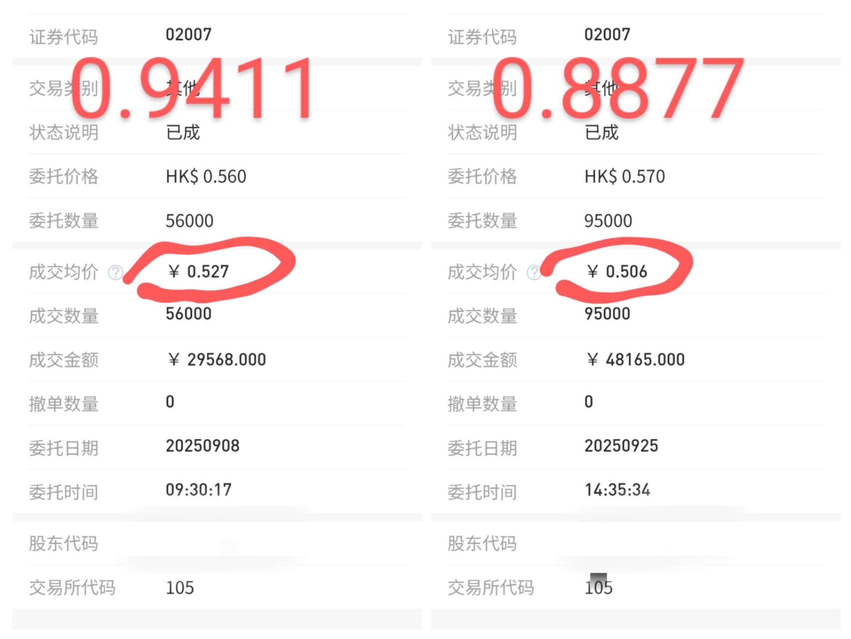 不是,真的还有小白想着,0.56卖出0.55买入能够挣钱的吗?。。。我的截图左边是买入,右边是卖出,计价方式采用的是默认的普通人都不知道还有可更改的撮合计价方式。都在九月份。买入汇率费了0.9411,卖出人民币/港币汇率才拿到了0.8877(估计是扣出手续费等等之后,具体我也没有仔细去核算过手续费明细)。但是我知道1分钱肯定会赔。。。