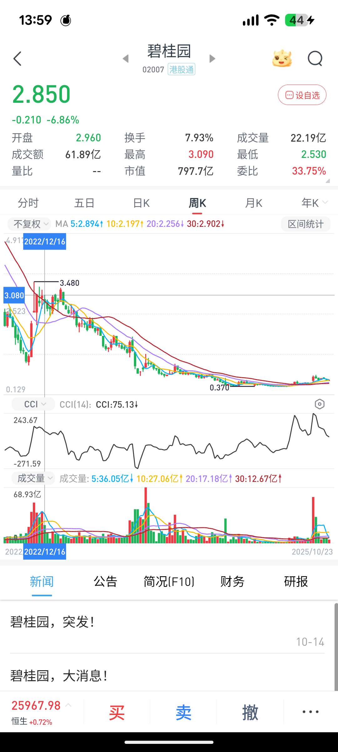 有多少人是被2022年11月老杨的那句“碧桂园已经穿越黑暗迎来了黎明的曙光”给匡进来的?来认识一下,看着没赶上那波300%的机会,我等着跌了两三个月开始慢慢介入,在第二波高峰盈利了一些,然后就滑铁卢了。。。貌似第二波高峰就是交权给杨惠妍的时候。。。希望杨二小姐度过了这么长的霉运期,来一波鸿运当头。