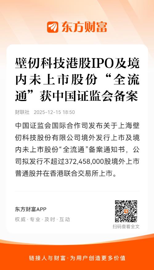中国证监会国际合作司发布关于上海壁仞科技股份有限公司境外发行上市及境内未上市股份“全流通”备案通知书,公司拟发行不超过372,458,000股境外上市普通股并在香港联合交易所上市。公司57名股东拟将所持合计873,272,024股境内未上市股份转为境外上市股份,并在香港联合交易所上市流通。