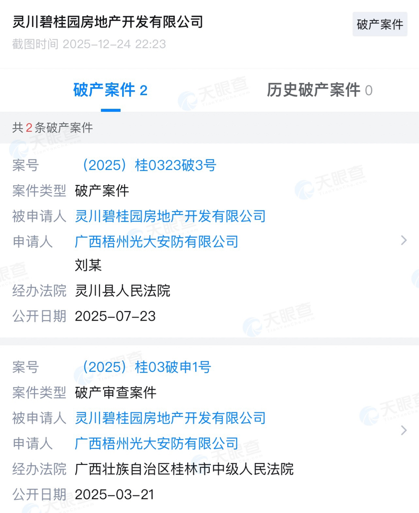 广西桂林的灵川碧桂园房地产开发有限公司已进入破产清算程序。
