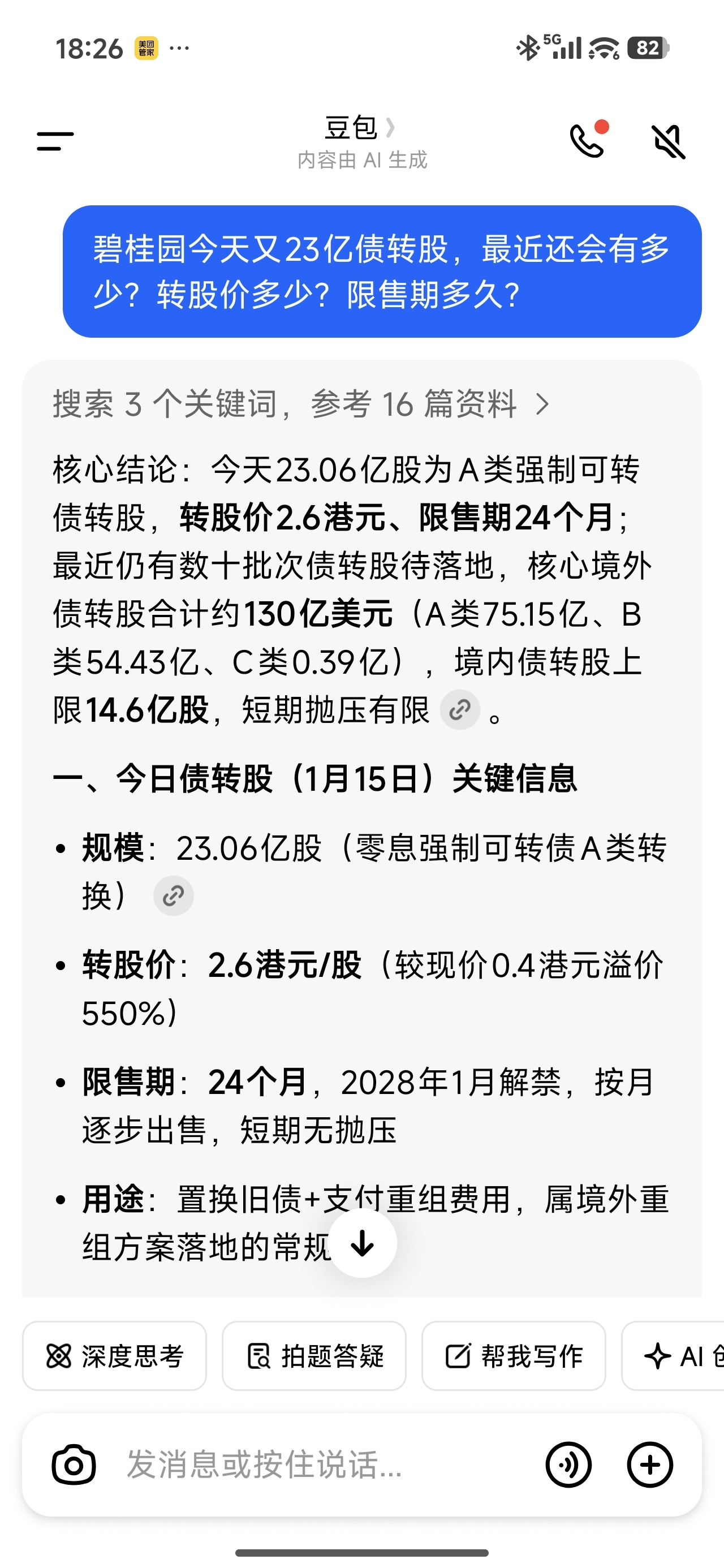 俗话说害人钱财如杀人父母,所以我不劝人买也不劝人卖。但是讲讲自己的想法就当鼓舞自己。碧桂园我持有两年,今天回本依旧没走,我说过格局到1块。前两个星期0.45我就说了可能破前低,破了我也补了,拉低了两分成本。今天有空分享一下重组债转股为什么余碧桂园是好事?明明股份增多了,抛压增大会压制股价,是的没错,短期可能利空甚至影响股价。但是长期绝对是利好,碧桂园的核心还是恢复正常经营实现自身造血。债转股实实在在的免除千亿债务换成300-400亿股票,那以400亿股票为例现在股价0.4港元一股,一共160亿港元。换句话说如果债权方真愿意现在卖股票,二级市场仅用160亿(实际如果全抛股票下跌还不需要这么多)就可以接下这短期要还的要命的千亿债务。而碧桂园有时间得以喘息,依靠政策,土储,一体两翼,机器谷,壁仞等上市公司投资,未来盈利后如果股价不上回购注销,用未来小的一部分钱解决现在的大问题。