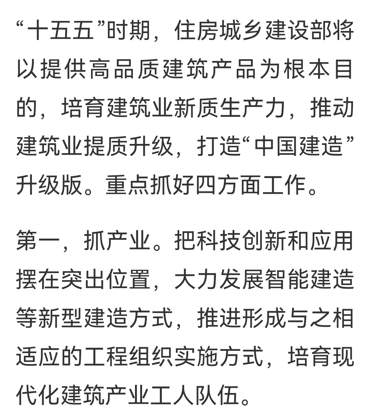 $碧桂园(HK|02007)$ $融创中国(HK|01918)$ $万科企业(HK|02202)$ 新华社记者采访了住房城乡建设部党组书记、部长倪虹。其中一条:把科技创新和应用摆在突出位置,大力发展智能建造等新型建造方式,推进形成与之相适应的工程组织实施方式,培育现代化建筑产业工人队伍。