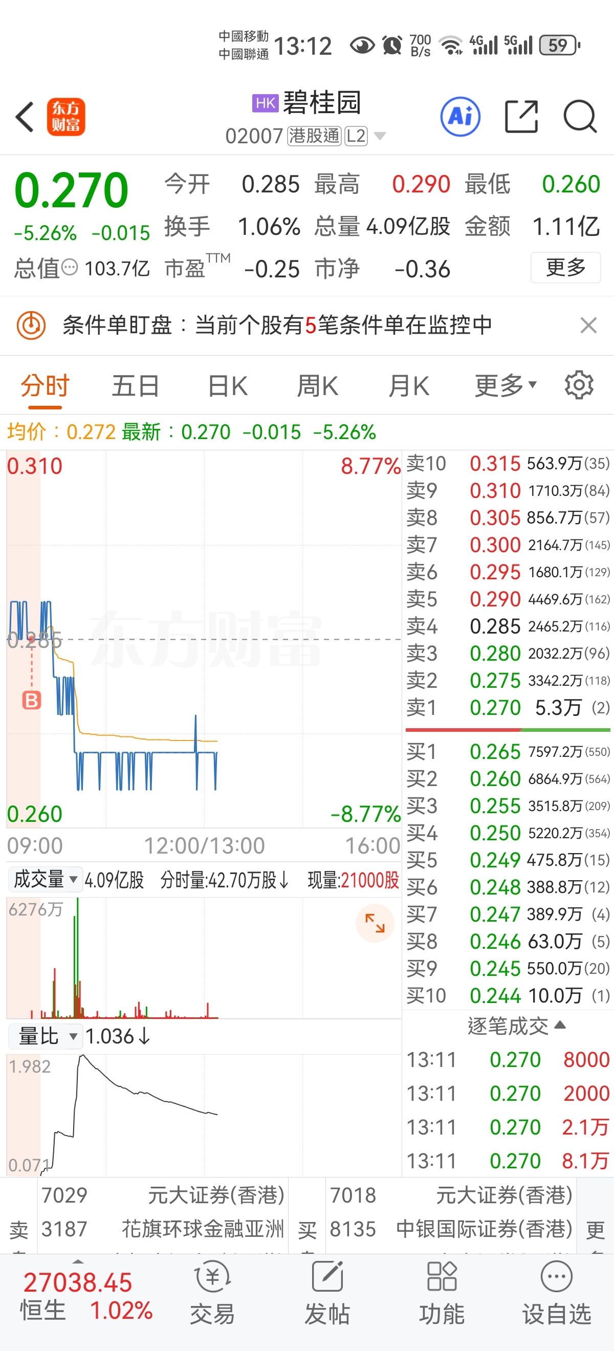 $碧桂园(HK|02007)$ 好神奇,0.27被吃了,0.275的压单变四千多万单,如果没被吃光就变成三千万多单