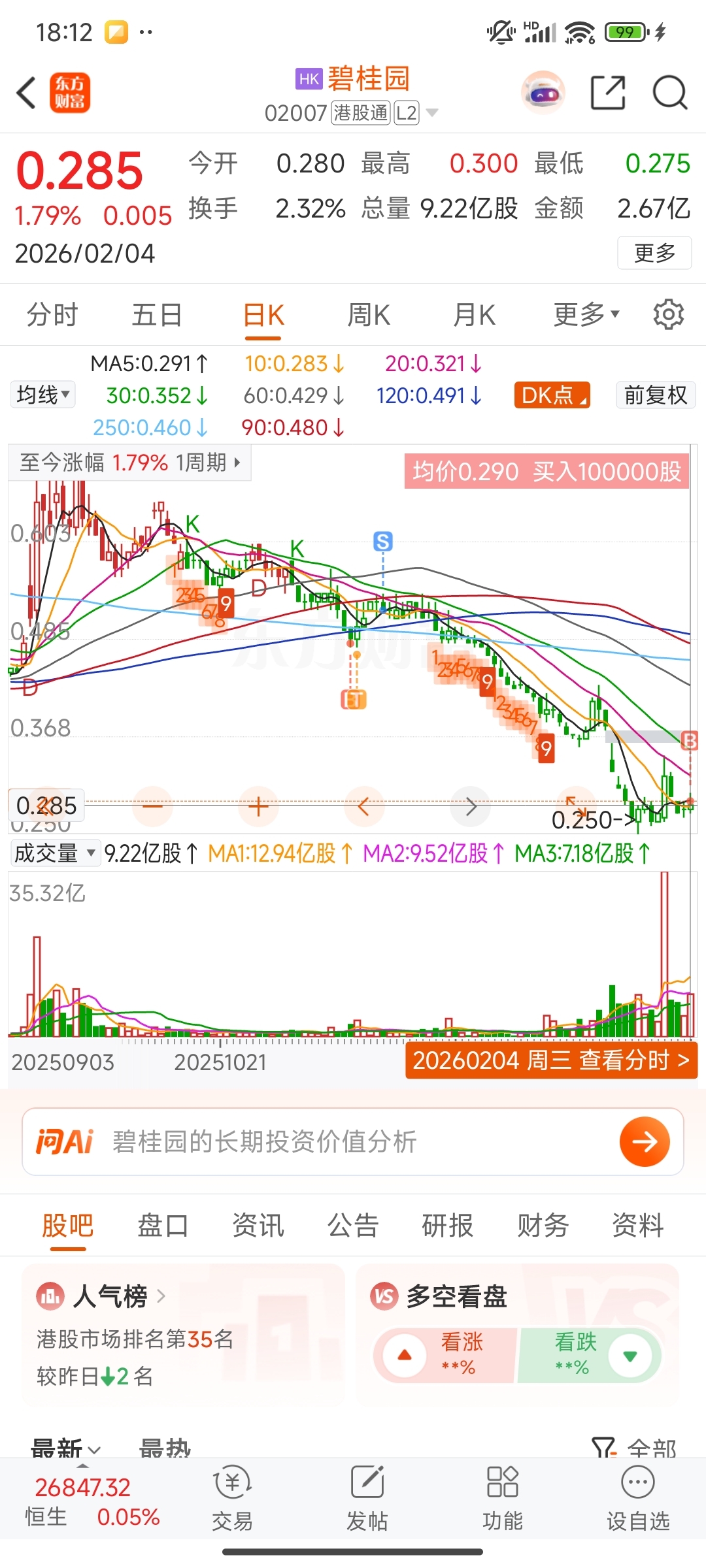 再次建仓碧桂园,两个月前买10万股需要5万,现在只需要不到3万