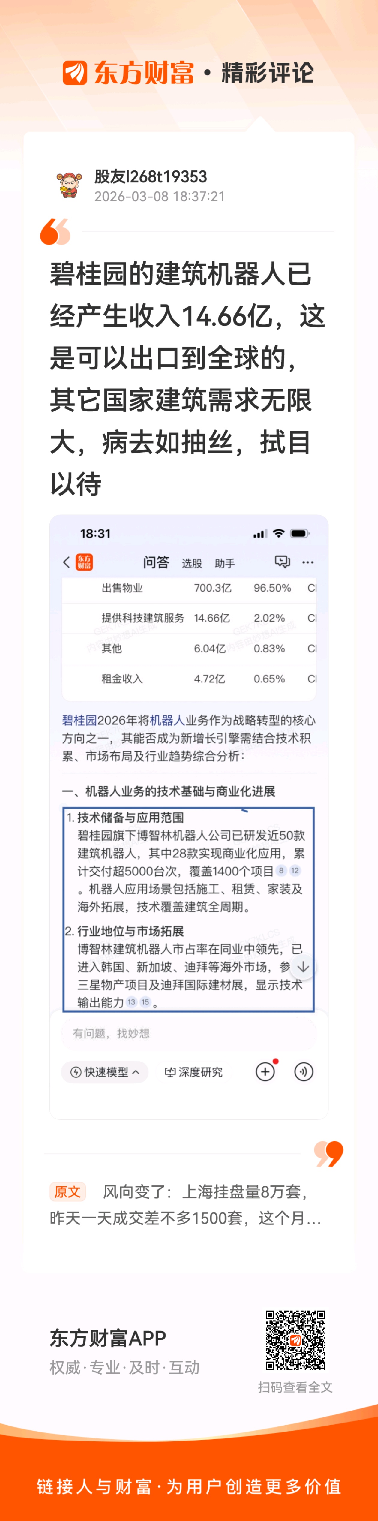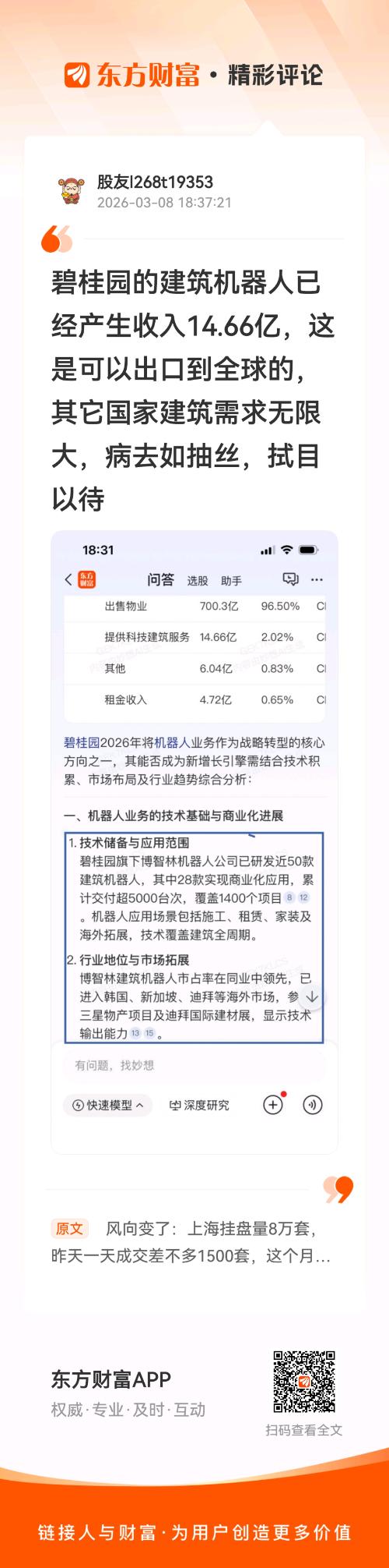 $碧桂园(HK|02007)$ 风向变了:上海挂盘量8万套,昨天一天成交差不多1500套,这个月估计要成交25000套,这样发展,挂盘急剧下降,压抑5年的需求涌入,卖家这价不愿再卖,促进房地产转向已成定局,很快会向全国蔓延,房地产股现在是地板上,从投资角度来看,入手正当时,以前过去5年,谁房子多,谁压力大,一旦转向,谁房子库存多,谁就赚得多,