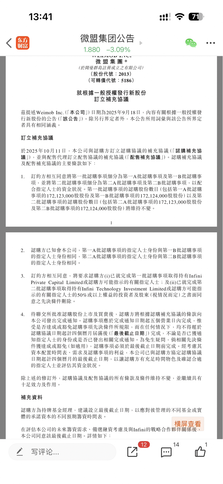 $微盟集团(HK|02013)$ 无极第一批被骗进来的钱已经亏了20%了吧?10月11日起四个月内完成全部认购?那就是2月10号之前要扩股完,无极还会扔钱进大坑吗?二级市场都比增发便宜