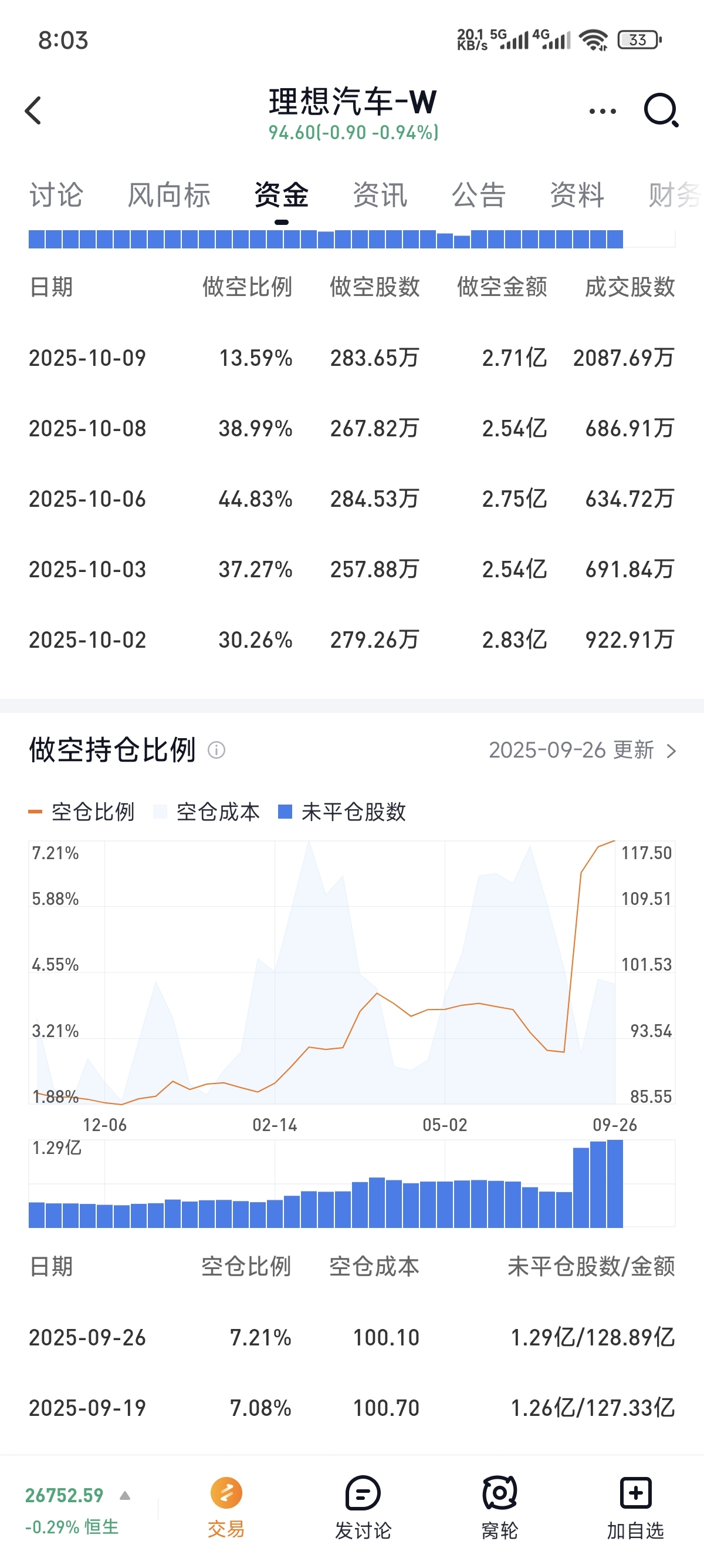 $理想汽车-W(HK|02015)$ 港股通一开盘,空头没有那么猖狂了,港股通不开盘,做空比例一度快50%了。$理想汽车(NASDAQ|LI)$