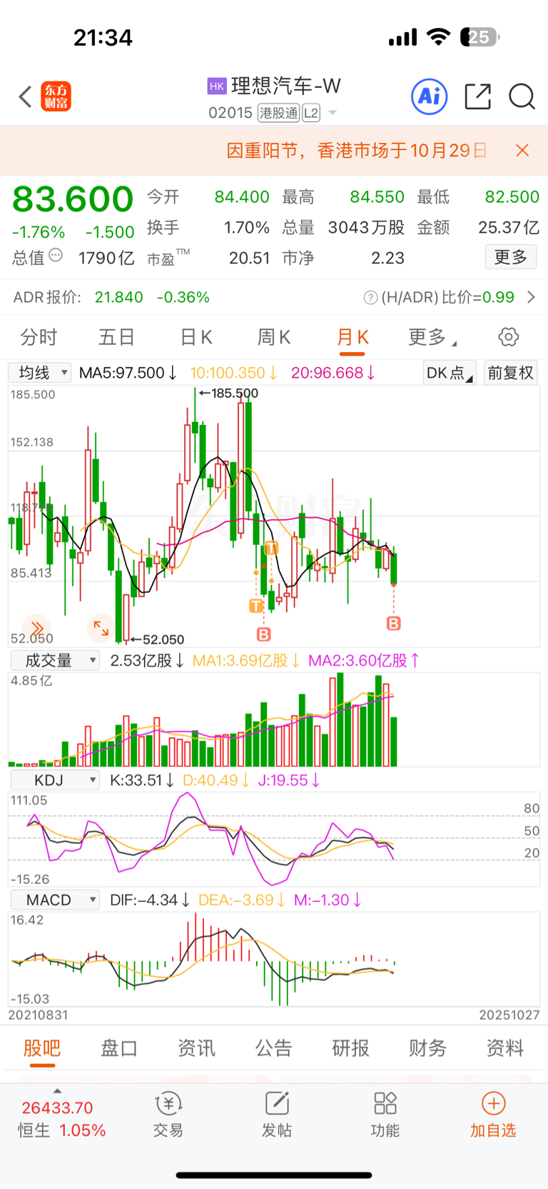 $理想汽车-W(HK|02015)$ 去年买了赌业绩 亏了我18个 25个点 今天我又回来了@葵宝不吃面 理想就剩下一个利空了 就是业绩