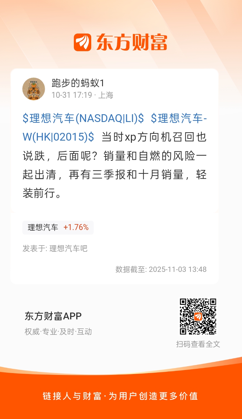 $理想汽车(NASDAQ|LI)$ $理想汽车-W(HK|02015)$ 当时xp方向机召回也说跌,后面呢?销量和自燃的风险一起出清,再有三季报和十月销量,轻装前行。