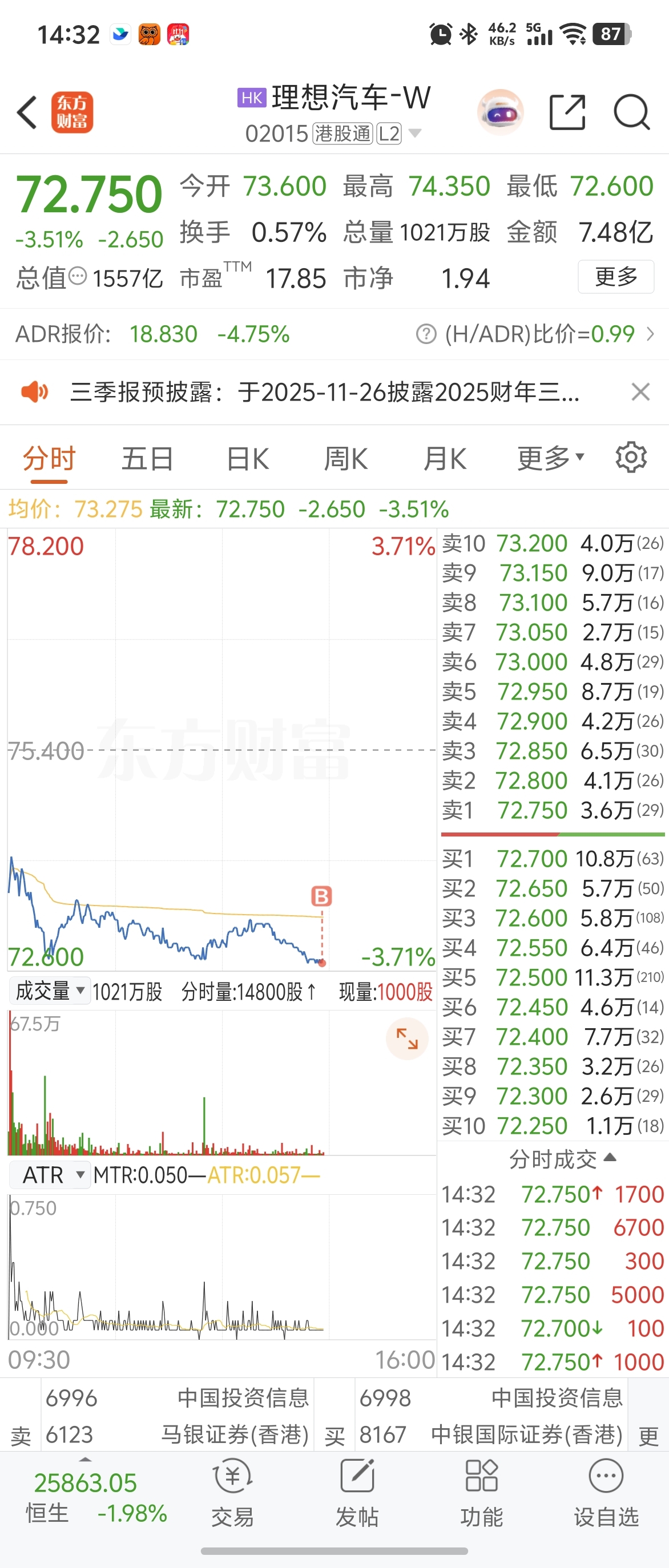 $理想汽车-W(HK|02015)$ 继续买入,预测今天小米财报大超预期,明天带领恒生科技反攻一天