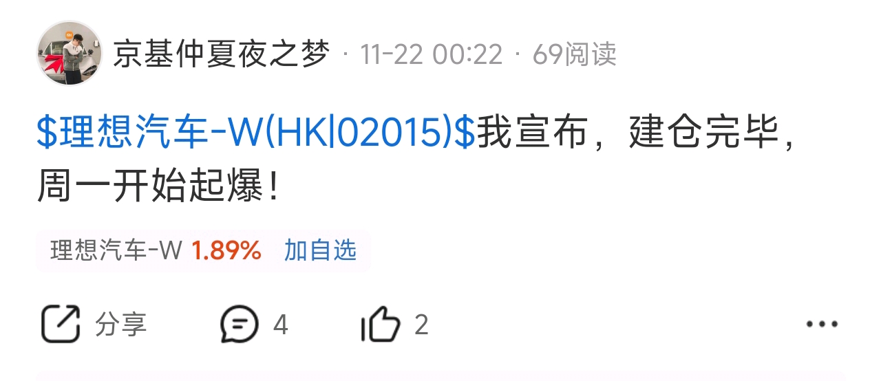 $理想汽车-W(HK|02015)$ 没有人懂我的含金量,上周五才是千载难逢的抄底时机,在车上的人享受胜利的果实吧!
