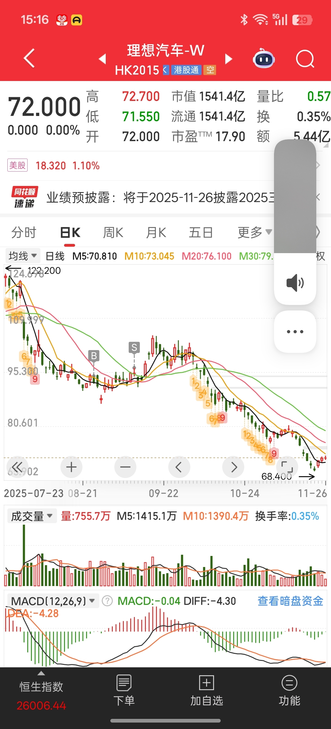 $理想汽车-W(HK|02015)$ 当时回本赚了一点点就卖了。以为卖在最低点了。现在时隔俩月回头一看。望不到的底。又想回来抄底了