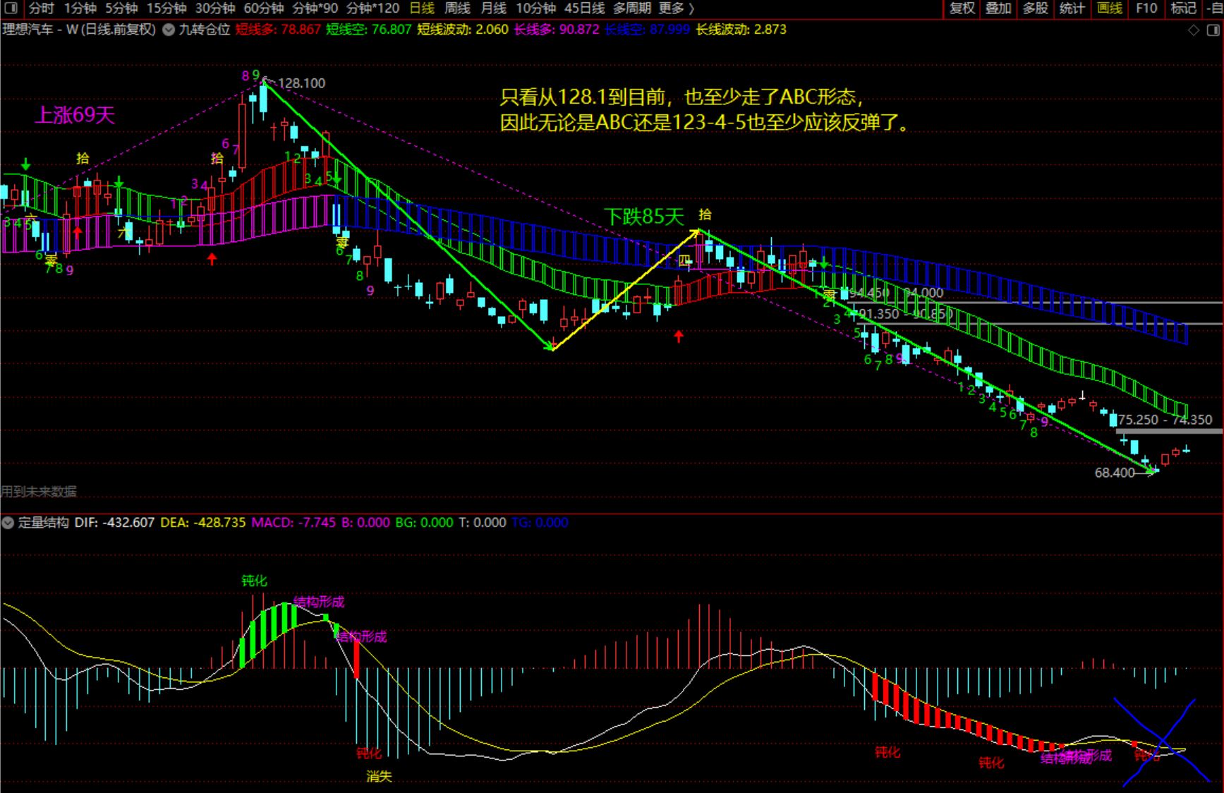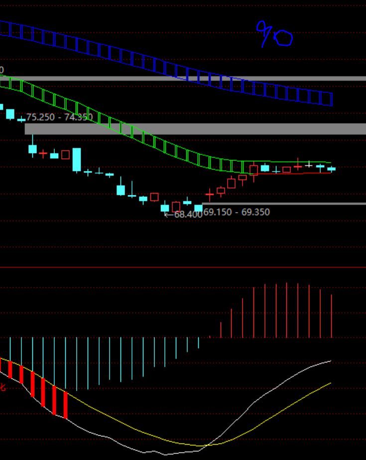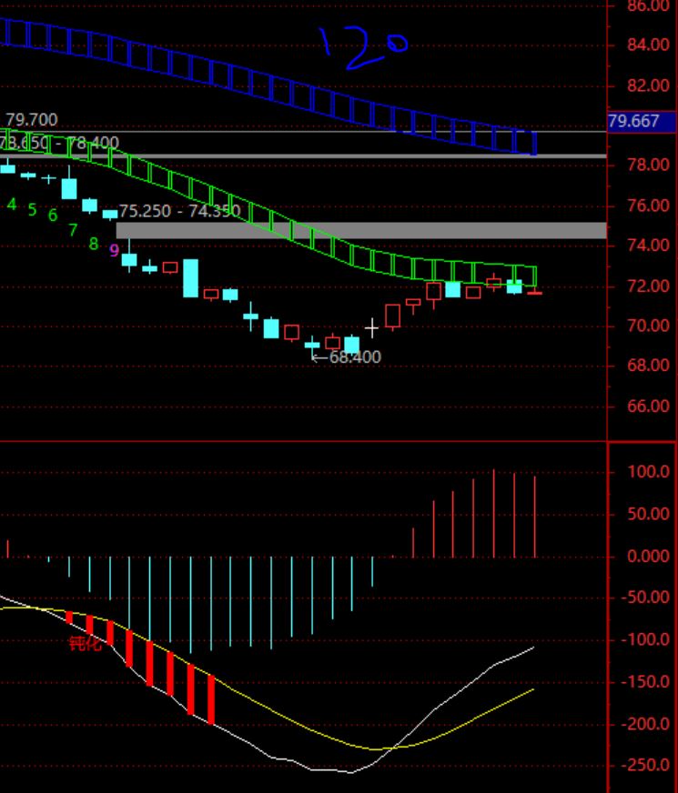 当前价格距离短期趋势上轨(78.8元,约9%)有点远,绿角线在缩短。如果反弹时间长一些,幅度大一些,出现的红角线越多,将来如果形成日线钝化则级别就大,机会就好。或者等待直接突破短期趋势(但反弹弱的话即使突破也有掉下来的肯能性)。