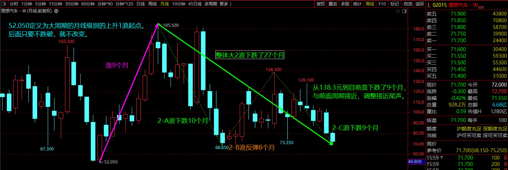 只要不破52.05元,我就将最高的185.5到现在都定义为大2浪调整。从节奏看,大1浪上涨9个月;大2浪一共调整了27个月:其中2-A调整了10个月,2-B反弹了8个月,2-C又调整了9个月。