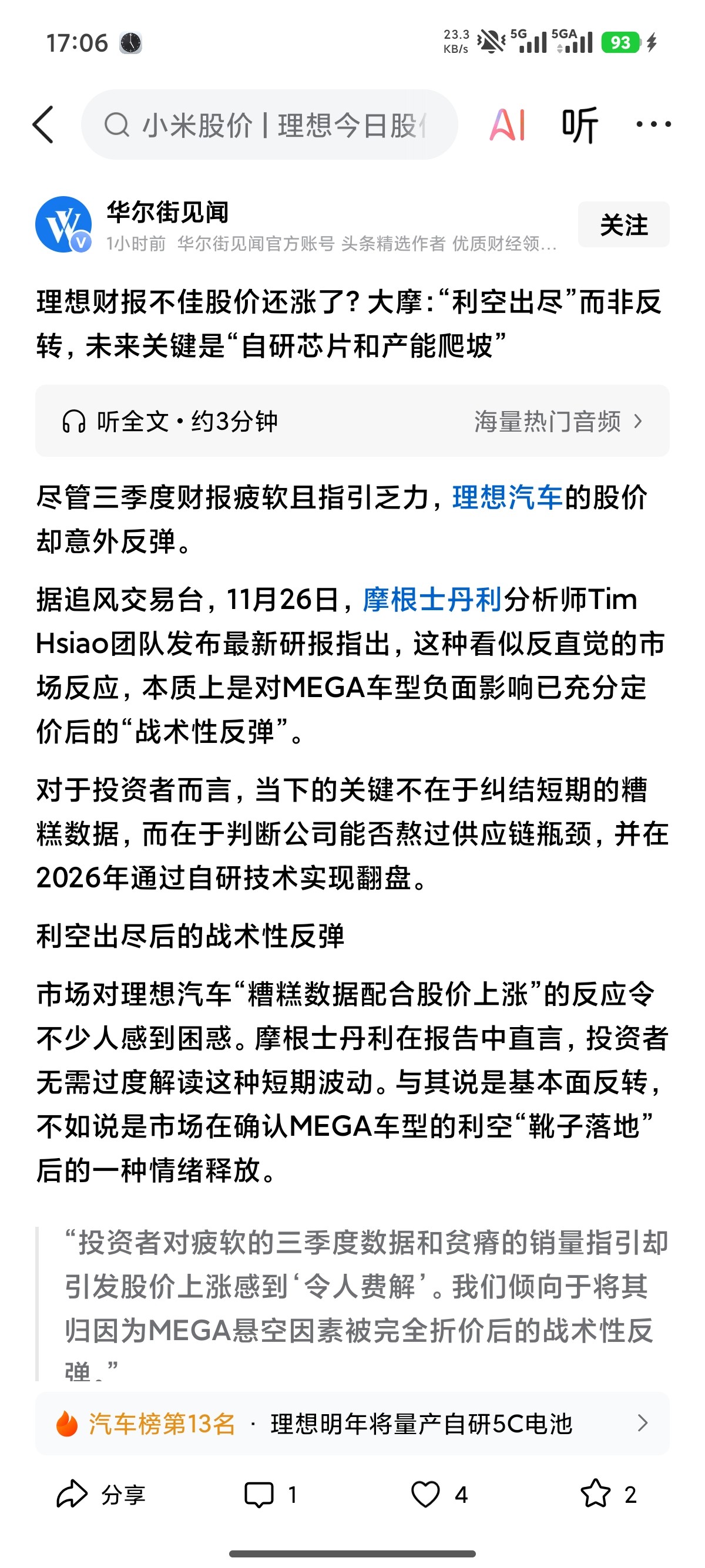 但无论如何,我想表达的是,现在是黎明前的黑暗,即使不是底部也距离不远了,完全没有必要悲观。如果李想想炒股,可以参与概念炒作,比如收购机器人,Ai公司,什么热就参与什么,毕竟账上还有小1000亿现金,弄点概念,股价很容易涨上去,所以情况其实没那么差,反正我不悲观。