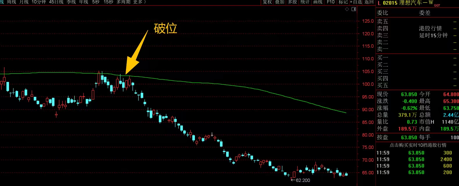 前段时间说过,理想跌破大均线后再次反抽,没能站稳,就形成了破位趋势,当时就需要大