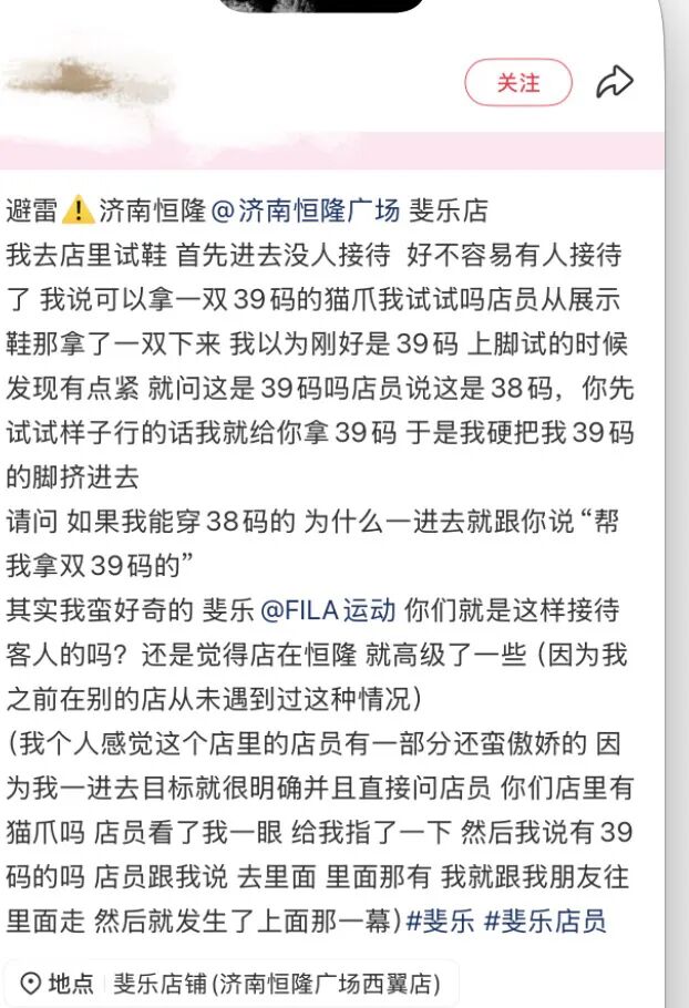 还有网友指出,济南恒隆广场的FILA门店导购态度差,自己想试穿一双39码的猫爪鞋,但店员在未告知的情况下,提供的是门店展示用的38码鞋,在顾客发现鞋子紧进而提出质疑时,才解释称“先试试样子,行的话我就给你拿39码”。