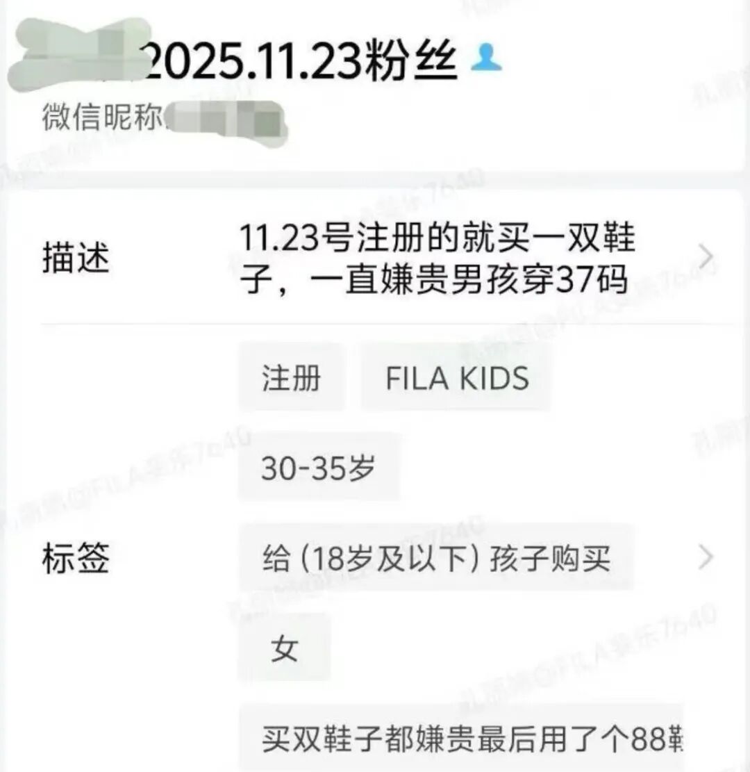 根据该消费者贴出的截图,其微信昵称为“2025年11月23日粉丝”,描述栏写着“11月23日注册的就买一双鞋子,一直嫌贵,男孩穿37码”,标签栏则备注“给(18岁及以下)孩子购买”“买双鞋子都嫌贵”……